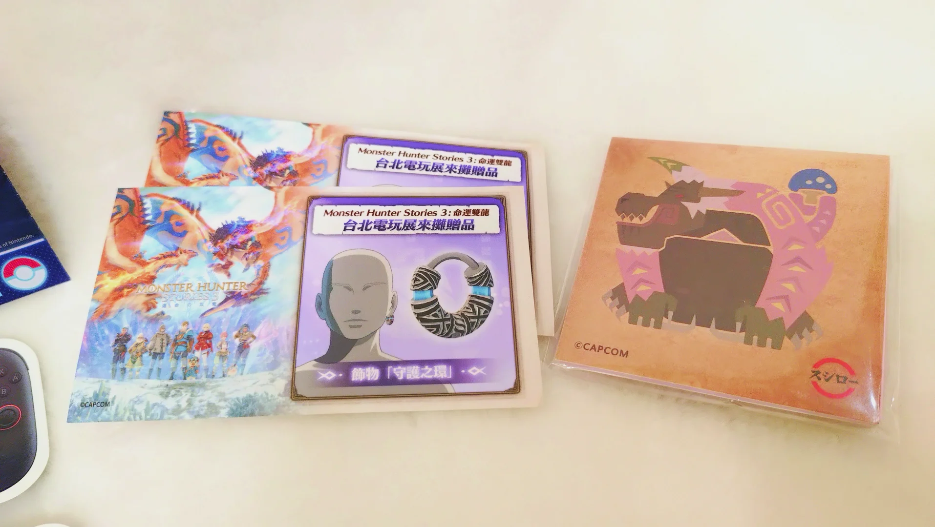 魔物獵人物語3也有很大方地送角色裝飾品,前幾天有去吃壽司郎聯名魔物獵人有送memo,也放在一起。