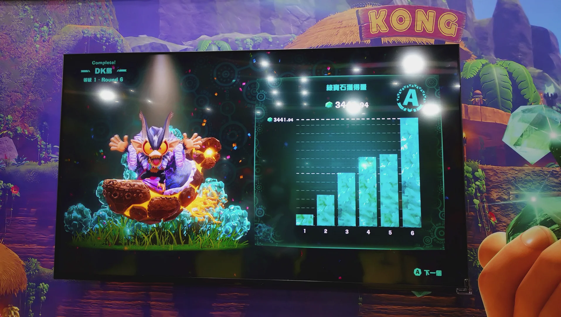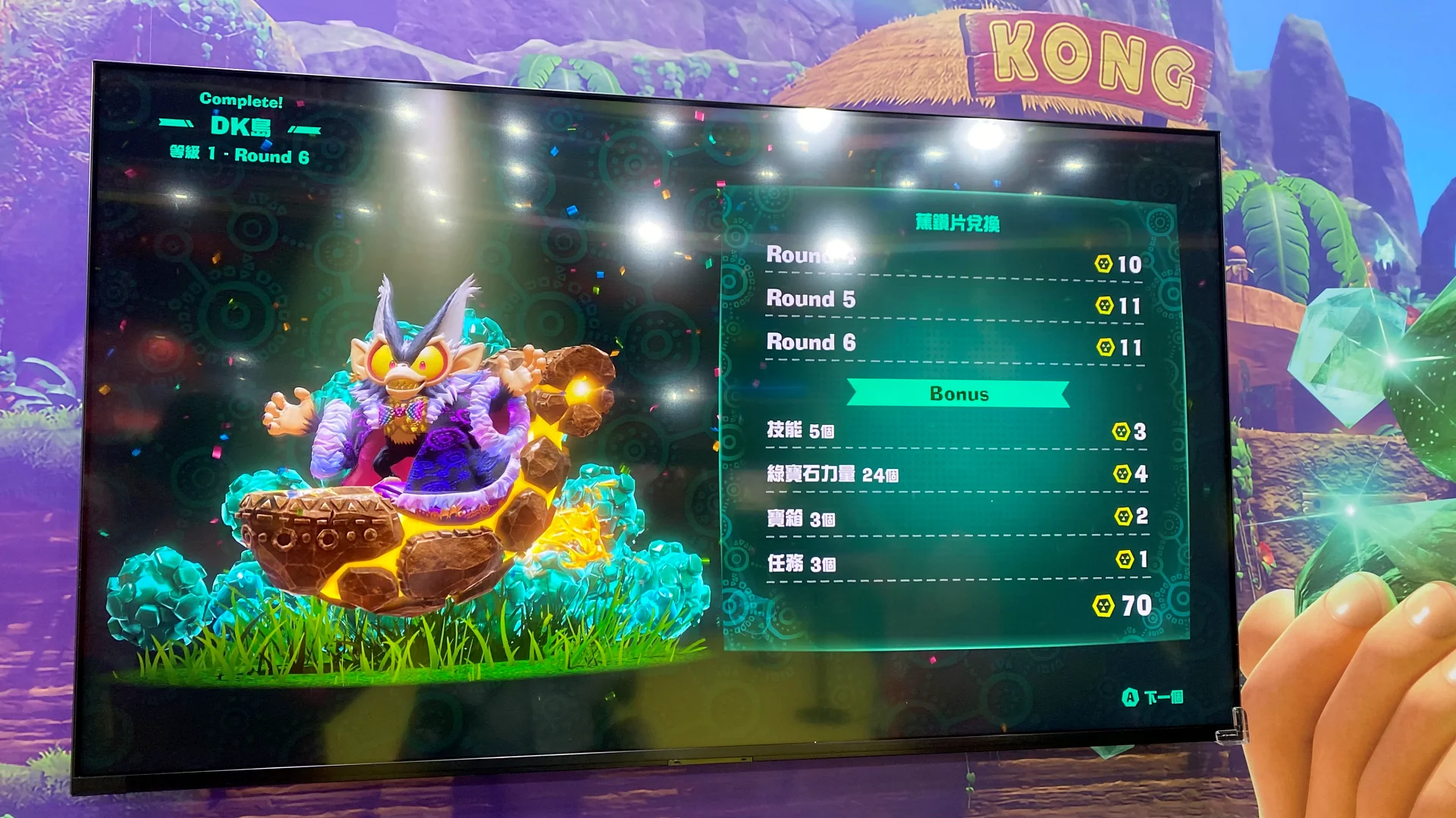 因為可能時間還算早,排隊試玩的人還不算太多,綠寶石可以一次玩20分鐘,真是大方。玩起來還算刺激,但我覺得這款DLC果然沒有那麼適合我,因為它每回合有限制時間、要急著找綠寶石採礦、又要解社長給的任務、還要找化石來強化自己,看地圖跟標示都眼花繚亂,對一個沒什麼方向感的人來說簡直災難🤣🤣🤣。(不知為何我看波琳唱歌都看不出指引往哪,是螢幕太亮嗎?)