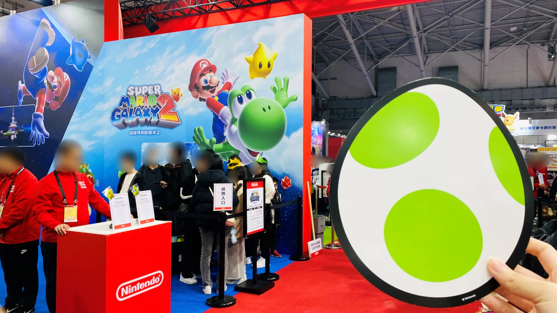 早上時入場有先跟瑪利歐跟路易吉一起拍照了!中午則是趕場去跟耀西和碧姬公主拍照,前年只有送瑪利歐的帽子,今年不但增加了路易吉帽子,還有公主的皇冠!在排耀西的隊伍的時候,我就在想不知道耀西是送什麼代表物,要是送蛋就太棒了。接著就看到Staff在發耀西蛋(紙片可當扇子),任天堂果然知道耀西粉想要的是什麼😭❤️!!!