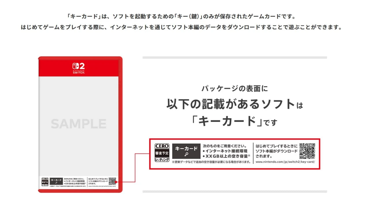 另外還有驗證卡(KEY CARD)機制,意思就是買了實體卡,但還是需要讓玩家自己下載軟體安裝,卡片只有驗證的功能🤔。調查了一下看起來似乎是因為任天堂這次的特規卡造價昂貴,連本家遊戲實體版都得比數位版多一千日圓,其他廠商要是開發的遊戲容量過大會很不划算,所以就採取這種驗證卡的方式了。雖然對網路不佳的地區玩家有點不友善,不過既然NS設計是不可能用光碟片的話,巨大容量的遊戲的確只能靠這方法解決問題了。可是反過來說,容量小的遊戲如果還用這種方式,那應該就是其他廠商自己想省製造卡帶的錢了………
